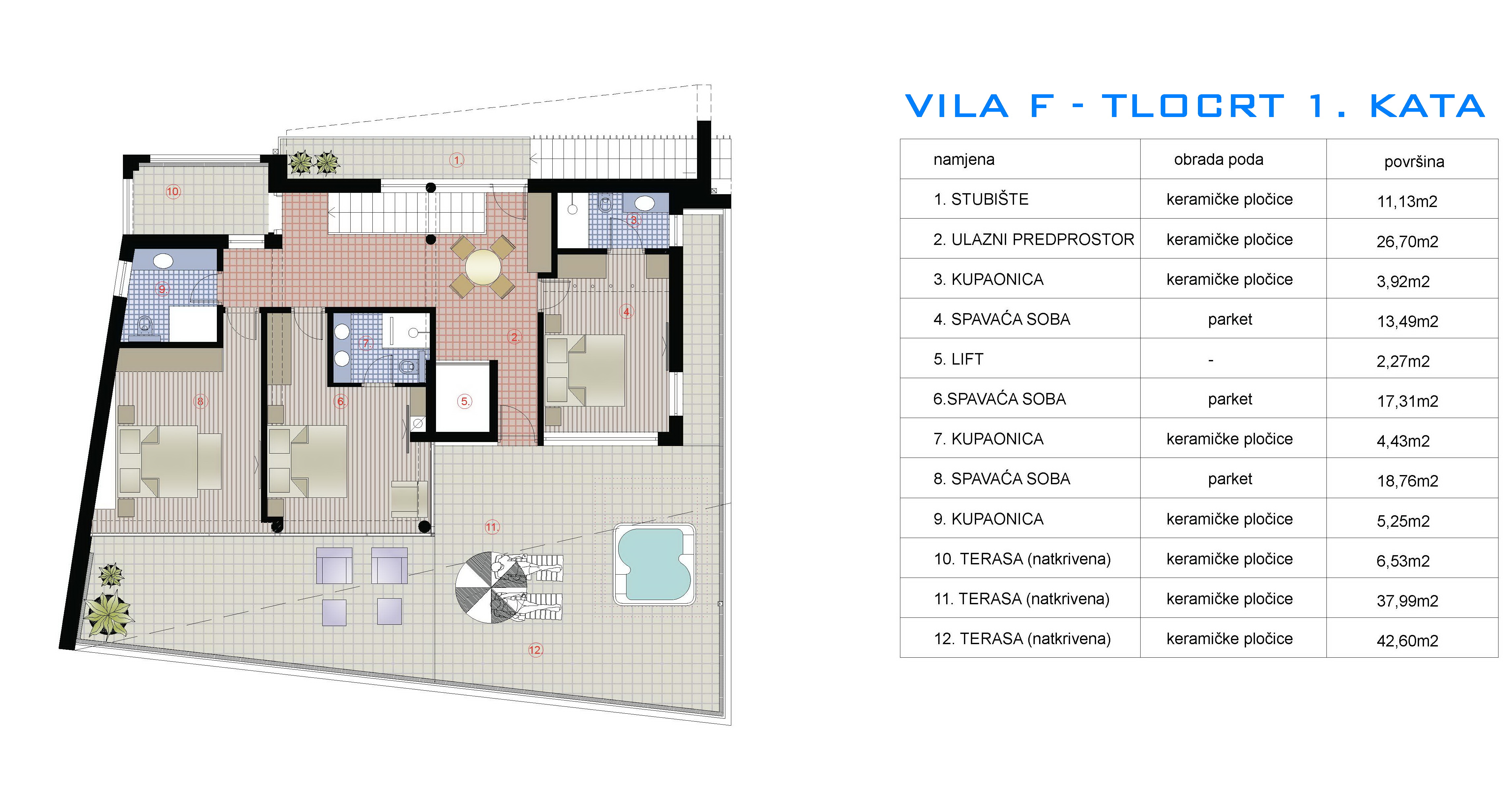 Ovaj visoko kvalitetan objekt, ukupne bruto razvijene površine 400 m2 izgrađen je po najvišim standardima i smješten na parceli od 755 m2. Objekt se sastoji od prizemlja i prvoga kata u kojem su smještena četiri apartmana (površina od 71 – 75 m2). Svaki apartman ima, dvije spavaće sobe, prostrani dnevni boravak s blagovaonom, te veliku terasu. U objektu se nalaze podrumske ostave za stvari za svaki apartman. Svakom apartmanu pripadaju po 2 parkirališna mjesta. Apartmanima u prizemlju pripadaju bazeni i vlastiti vrtovi, ukupno 2 po objektu. Zbog solidnosti gradnje, objekt posjeduje visoku razinu energetske učinkovitosti kategorije “A“ te stoga ima preduvjete za ugodan boravak tijekom cijele godine uz niže troškove za hlađenje i grijanje.
